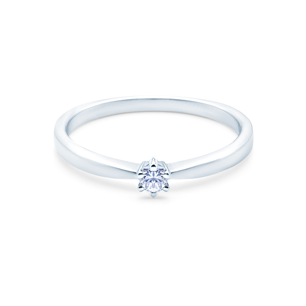 Pierścionek zaręczynowy z centralnie umieszczonym diamentem 0,06 ct o perfekcyjnym szlifie brylantowym, wysokiej czystości i kolorze SI2/H (wszystkie diamenty w naszym sklepie objęte są wieczystą gwarancją oraz posiadają oryginalny certyfikat jakości, wystawiany przez naszą firmę). Wykonany z 14-karatowego białego złota (próba 585).