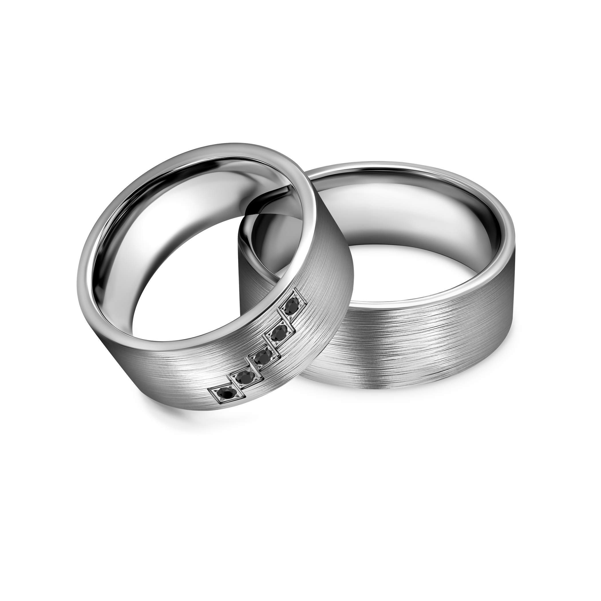 Obrączki ślubne wykonane z czystego tytanu, o szerokości 8 mm. Obrączka damska z 5 diamentami o łącznej masie 0,075 ct.