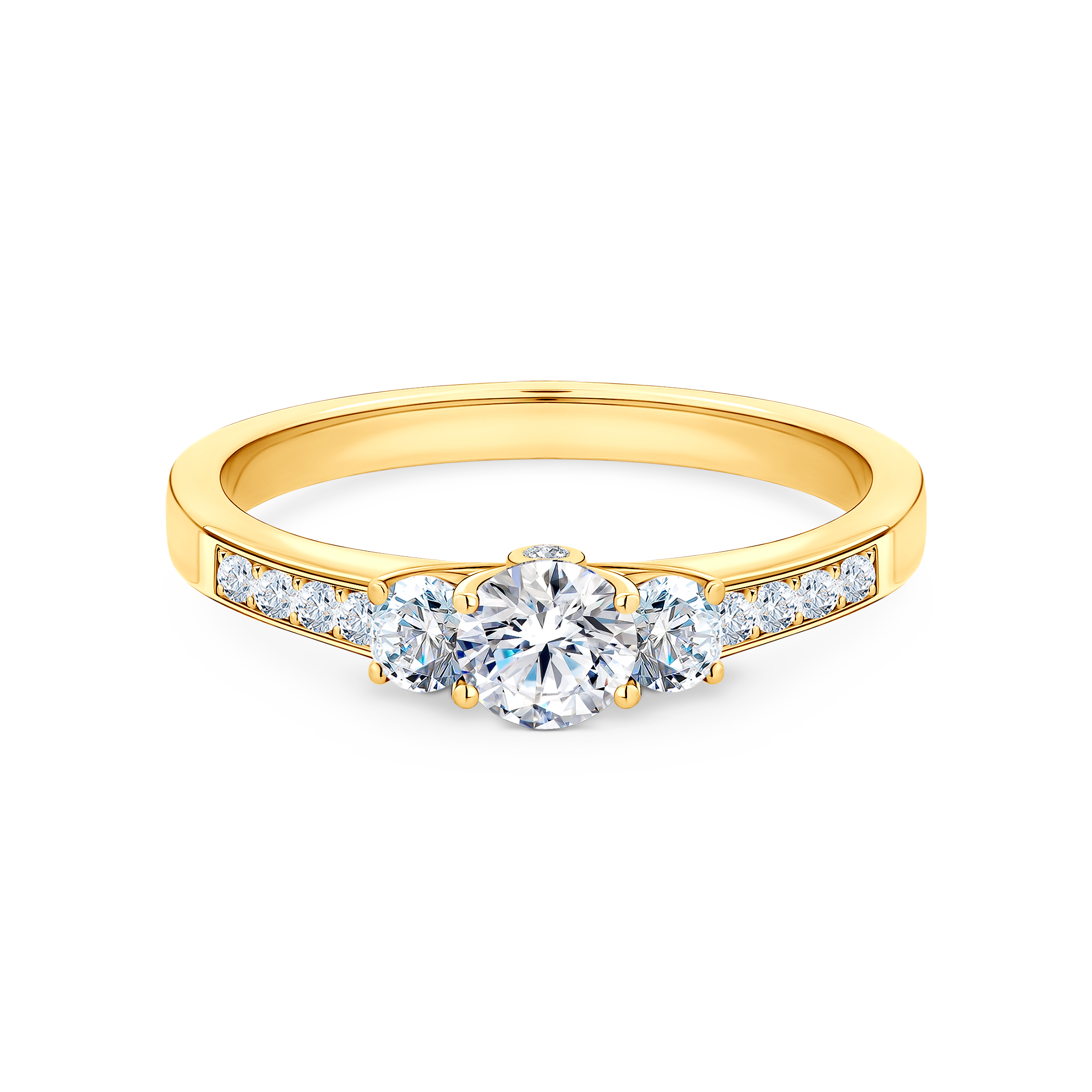 Pierścionek zaręczynowy z centralnie umieszczonym diamentem laboratoryjnym o masie 0,20 ct oraz 12 bocznymi diamentami laboratoryjnymi o łącznej masie 0,264 ct i szlifie brylantowym. Wykonany z 14-karatowego żółtego złota (próba 585).