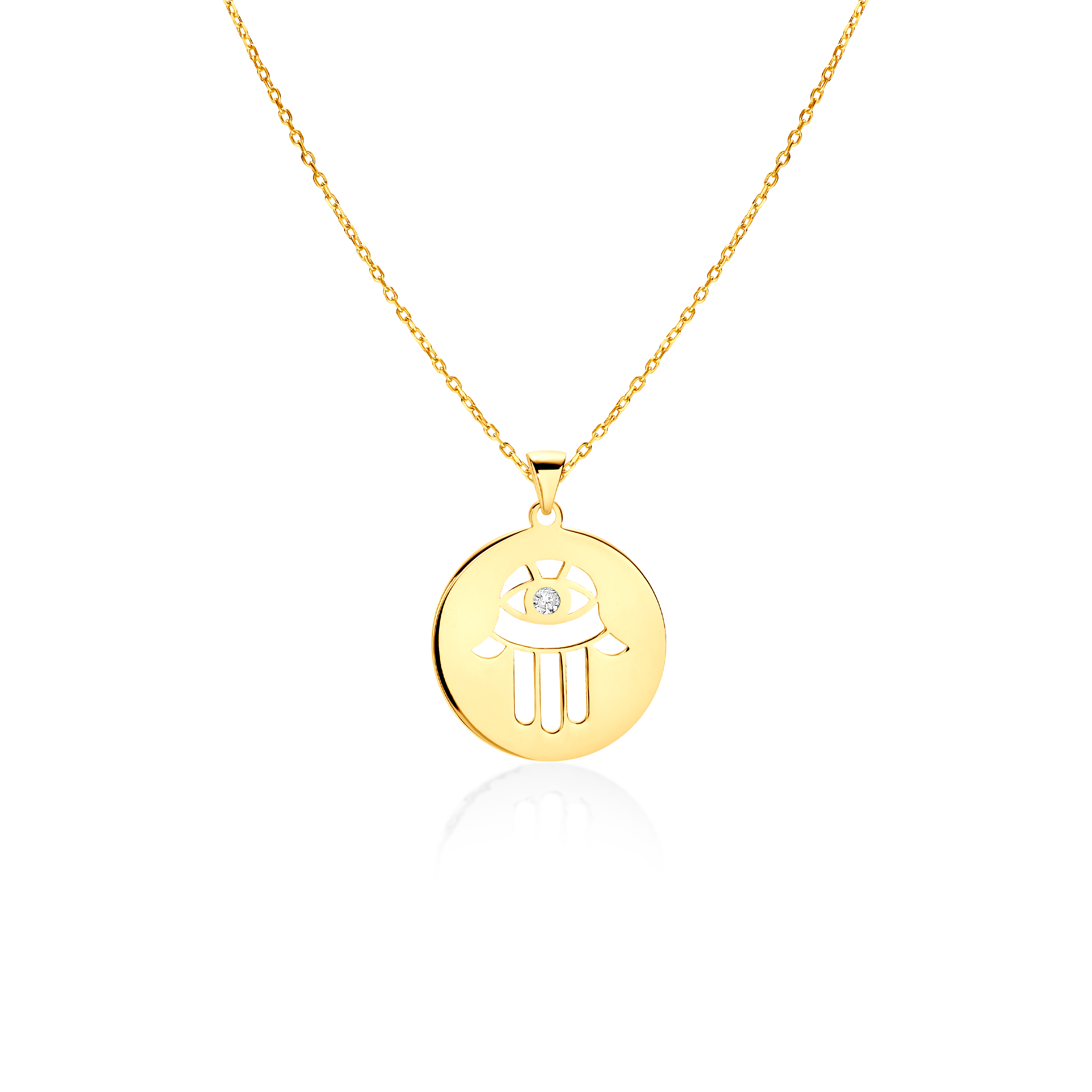 Naszyjnik ręka fatimy wykonany z żółtego złota (próba 585). W naszyjniku został osadzony diament o łącznej masie 0,01 ct.